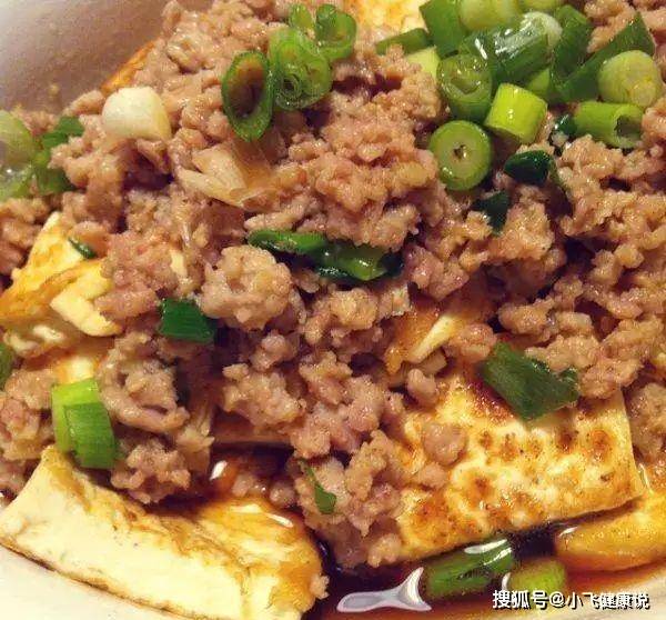 3.事先剁碎肉,放點醬油、鹽調味,鍋里熱油,放醃好的碎肉末炒熟盛出,鋪在豆腐上;撒上蔥花;