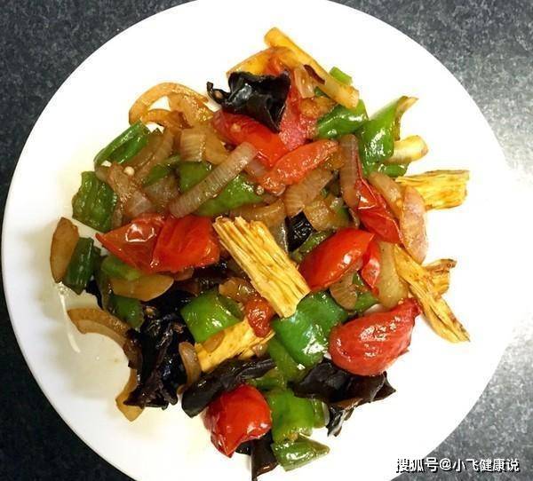 材料: 青椒2個、木耳幾朵、腐竹數根、洋蔥1個、西紅柿1個、鹽1勺、生抽適量、食用油2湯匙、蒜1個、雞精適量;