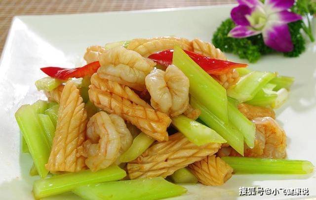 2.西芹切片,過開水焯燙至變半透明,撈出過涼開水