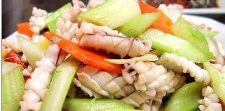 材料:西芹、魷魚、料酒、胡蘿卜、蔥姜、紅椒、味極鮮醬油、油