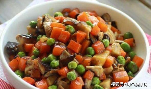1、胡蘿卜,香菇焯水瀝干水份,切成1cm見方的小丁,豌豆焯燙3分鍾撈出瀝干。姜切末備用。