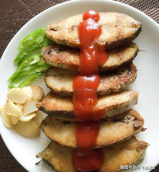 2、鍋內加少許油至八成熱放入蒜片炒熟撈起備用,放魚片煎至焦黃起鍋撒上黑胡椒粉淋上番茄醬