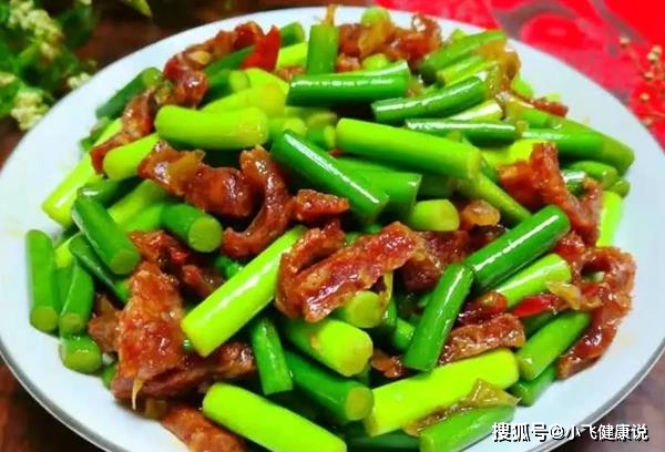 食材:蒜薹1把、臘腸半根、蔥白1段、小米椒2根、姜1片、少許鹽、五香粉、蚝油、生抽。