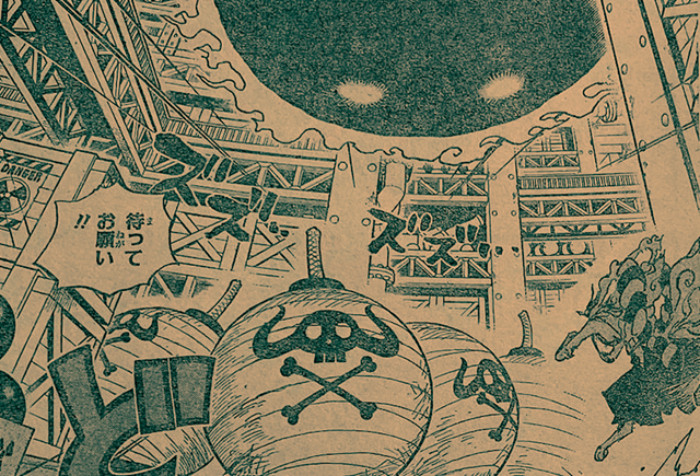 基德和羅突然蘇醒,羅再次發動覺醒技能,長刀從BIG MOM右臂刺入,從臉上刺出,從內部破壞的沖擊,重創了BIG MOM。基德趁機利用磁力,組裝出一頭金屬牛,蠻橫的沖撞了BIG MOM。