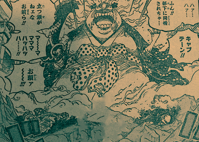BIG MOM瘋狂攻擊基德和羅,一番攻擊之後,基德和羅翻白眼重傷倒地不起。基德和羅的船員打算搶救重傷的船長,卻被BIG MOM釋放的滿大自在天神覆滅。BIG MOM自認為解決了所有人,打算上屋頂找凱多。
