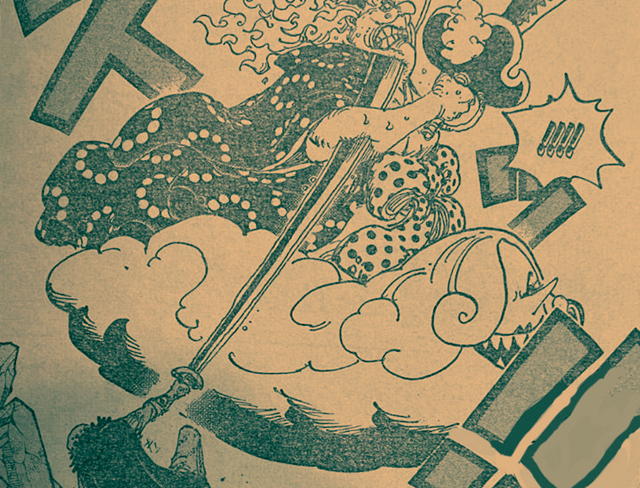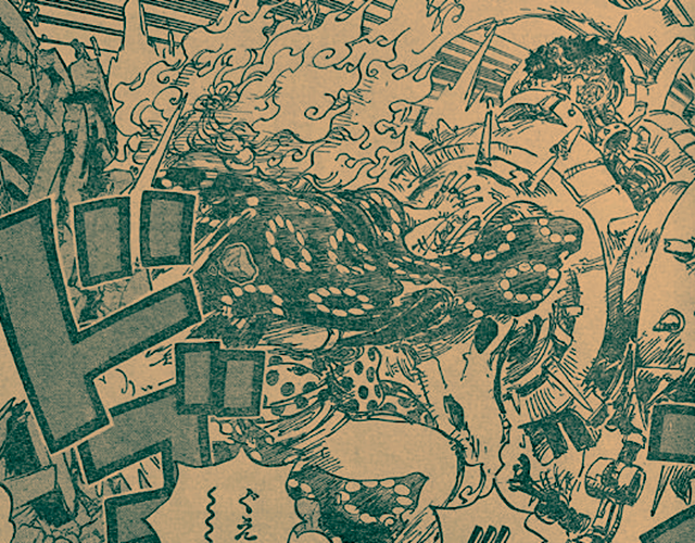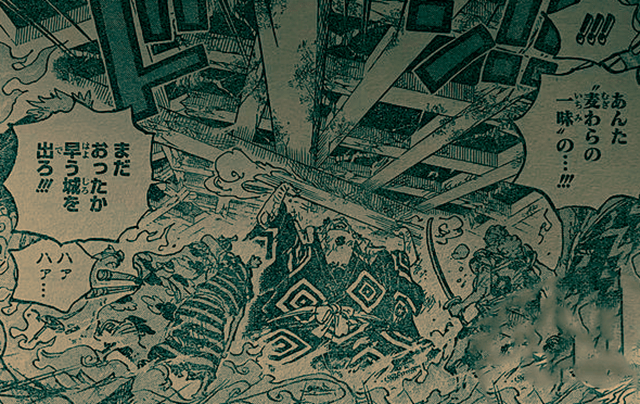 海賊王漫畫1038話情報,本話的鏡頭從凱多和路飛的戰斗,轉向了其他戰場。鬼島上的大火愈演愈烈,建築物在燃燒,能落腳的地方越來越少。索隆遭遇了迷之死神,以藏遭遇了CP0,基德和羅重傷了四皇BIG MOM。