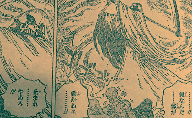 喬巴怪物化的副作用結束,變回了正常的喬巴。但是,喬巴很擔心索隆,超恢復藥的副作用,會讓傷害加劇。與此同時,重傷的索隆雖有意識,但無法行動,而在他面前,出現一位揮舞死神之鐮的骷髏。