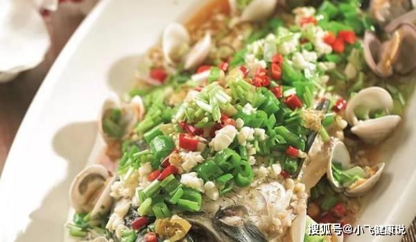 1.鯽魚洗淨擦乾擺盤,加入精鹽、野山椒、花雕酒、乾花椒,四周擺上白貝,上籠蒸8分鍾,取出潷掉湯汁。