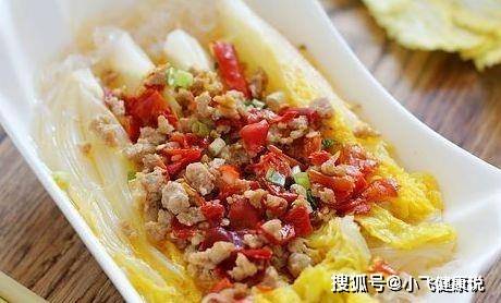 8、把炒好的剁椒肉末均勻的澆在娃娃菜上