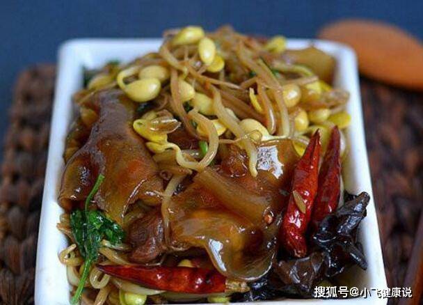 材料:黃豆芽300克、五花肉100克、黑木耳50克,粉皮50克、色拉油、食鹽、味精,蔥、姜、八角、花椒、干辣椒、香菜少許