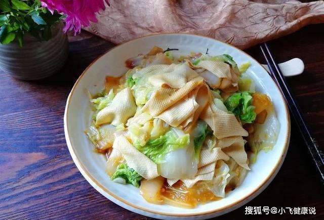 6.下入白菜片大火翻炒,將白菜片炒制斷生,稍變軟,下入豆皮翻炒均勻,下入鹽和蚝油,快速翻炒均勻,關火,盛出裝盤即可