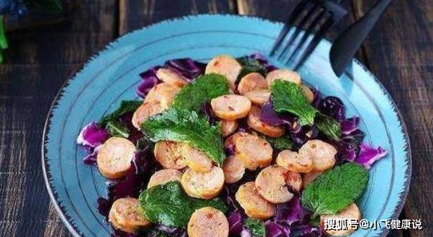 材料:香腸6個、紫甘藍30g、薄荷4顆、橄欖油1大勺、鹽1小勺、白醋1小勺、黑胡椒粉0.5小勺