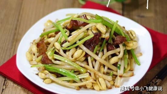 材料:花生芽500g 、五花肉50g、 香芹100g、油適量 鹽適量 白糖適量 生抽適量