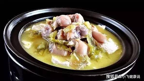 2、鍋里放化豬油和色拉油燒熱,先下薑片、蔥段、泡青菜絲和野山椒炒香,摻鮮湯並加鹽、胡椒粉調味,再倒進高壓鍋,放入豬手塊後上火壓至脫骨待用。