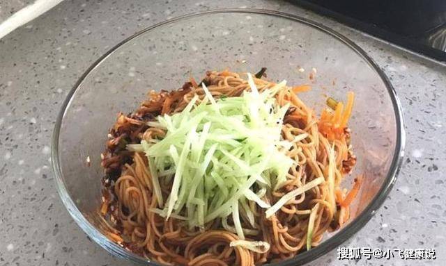 6、爽滑的面條拌上調料,擺上黃瓜絲和胡蘿卜絲,一碗可口的雪碧拌麵完成了