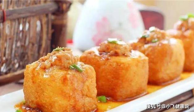 1、在每個油豆腐上開一個口子,用勺子把裡面掏空,然後放在開水裡燙一分鍾後撈起來,把水分擠干。