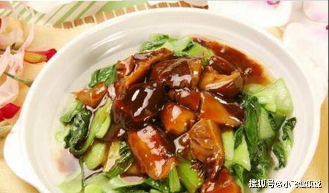 4、放入冬菇和浸泡冬菇的湯,燒至菜梗軟爛,加入味精調勻即成。