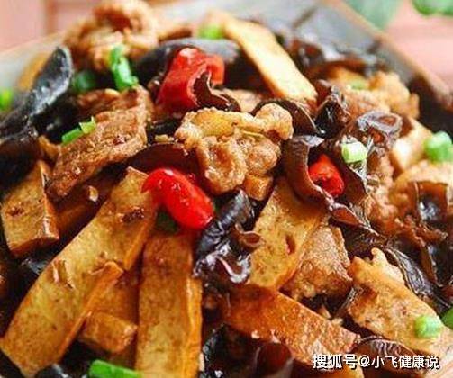 4、下胡蘿卜翻炒至稍軟,下黑木耳和香乾,翻炒均勻後烹入少量鹽和醬油炒勻。