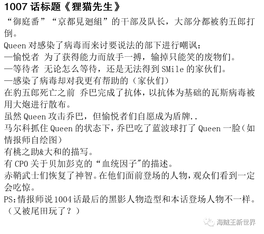動漫 海賊王1007話第一次情報更新|怒甩QUEEN一臉的狸貓!神秘人物會讓人吃驚? 2021 年 8 月 22 日 情報源均來自海外論壇 僅供海米討論分析使用 如侵權請聯系我們處理 看標題就知道本話是喬巴發威 喬巴怒揍QUEEN如下圖: 展開全文 (情報師手繪圖) 下周休刊! QUEEN這麼嘴欠,報應終得來! 赤鞘武士們恢復神智,還能再戰斗嗎? 神秘人物究竟是誰?(反正不是艾尼路、阿銀!) 作筆記是好習慣,給你新想法 相關文章: 四月番紛紛延期!來補十年前的老番吧! 靈魂在吶喊!讓我們在線去絕景露營! 希望被《銀魂》的完結欺詐永遠騙下去! 海賊王989話第一次情報更新|疑似古代巨人族,尾田開始填坑? 海賊王992話 第二次情報更新|凱多被輪番擊傷,赤鞘眾甚至用起御田的大招? 《EVA終》早期設定公開,機體造型充滿「惡趣味」! 《新·假面騎士》公開!庵野秀明擔任導演,50周年圓夢之作 P站美圖推薦——半睜眼特輯 《魔法少女伊莉雅》出香水 全天感受美游她們的味道吧 開局無敵,直接泡走妹妹?這個男主堪稱裝逼之王