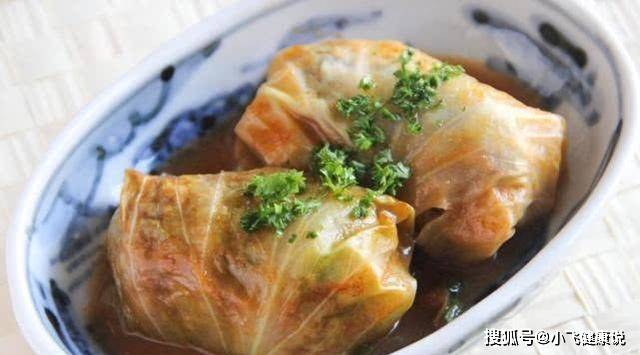 5.取一張焯過水的白菜,在葉片上放入肉餡,將肉餡用白菜包好捲起來。