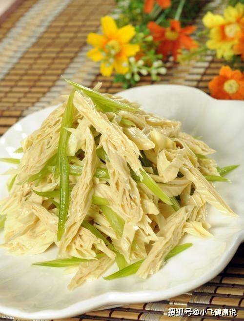 3、把焯好的腐竹,芹菜撈出控水,放入盤中,放入鹽,雞精拌好。