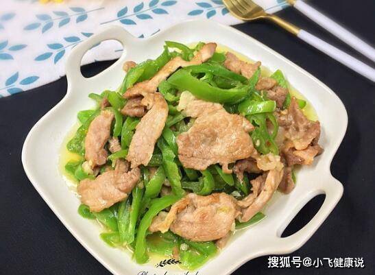 6.炒至肉片微微變色,下入青椒不停翻炒。
