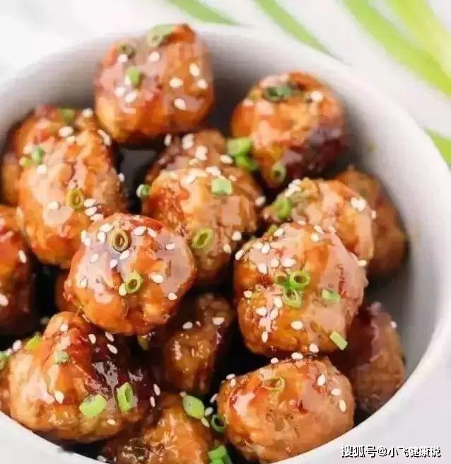 5、將烤好的肉丸放碗裡,再倒上照燒醬,撒上蔥花和芝麻就OK了。