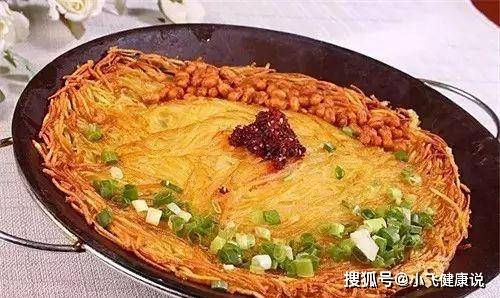 3、鍋下豆油80克燒至八成熱(油溫要高,否則攤不成餅),放入土豆絲攤成餅狀,中火煎單面1分鍾至金黃色,大翻勺後繼續用中火煎1分鍾至八成熟時起鍋,盛到平鍋內的洋蔥絲上,點上適量香蔥圈、香菜段、油炸辣椒以及酥黃豆,點小火即可上桌。