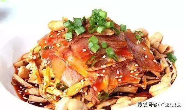 3、出菜時把牛臉切成薄片,納盆加炒過的筍絲、鹽、味精、白糖、紅油、醋、白芝麻、花椒麵和蔥花拌勻,裝盤即成。