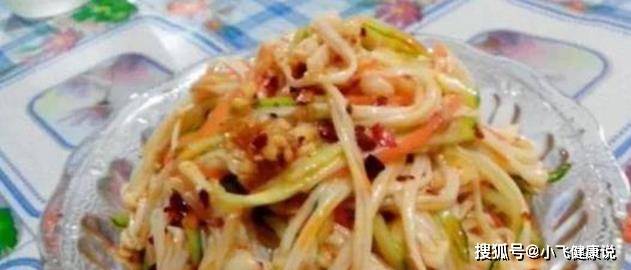 1、把金針菇去頭洗淨撕開,入水焯一分鍾左右,撈出過涼白開擠干備用。