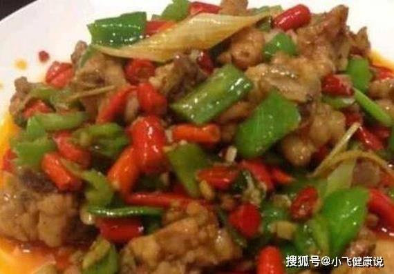 5.尖椒的辣味炒出來後倒入炸好的雞肉了,加鹽,炒到尖椒變色就可以了