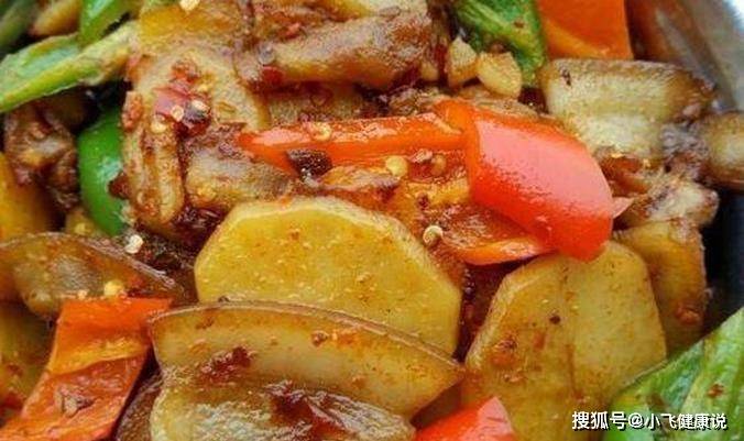 2、鍋內放五花肉下鍋煸炒熟後出鍋。鍋內加適量油,土豆片下鍋慢慢炸熟。