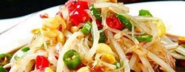 食材:粉絲1束,油炸花生米(去衣)、香菜葉各少許,紅椒,野山椒、豆芽,辣椒油、陳醋、食鹽、麻油各適量。