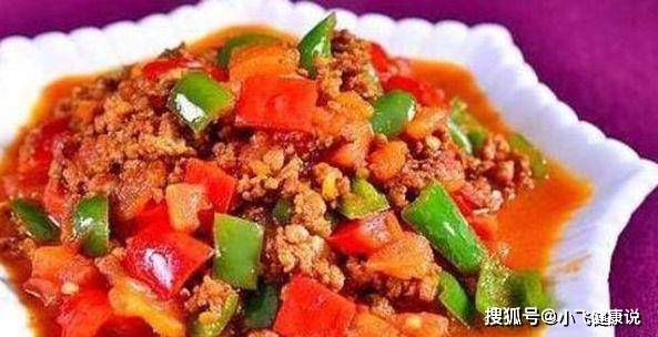 4、將肉推到鍋沿,炒香大青椒和大紅椒丁。下入番茄丁炒斷生。將肉末推下,調入醬油、適量鹽和雞粉炒勻入味即成。