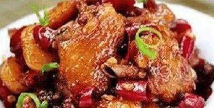 3.干辣椒剪段,起鍋坐油,加入花椒和麻椒各半,小火煸至褐色。放入辣椒和蔥薑末煸出香味,放入雞塊,中火翻炒均勻。開大火,沿鍋邊淋入一大勺料酒,加少許白糖,炒勻關火即可。