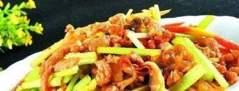 4、鍋留底油,放入泡椒、泡姜和大蒜炒香,放入泡蘿卜絲炒出香味,加入肉絲炒勻,調入雞粉和香醋炒勻,放蔥段翻勻即可。