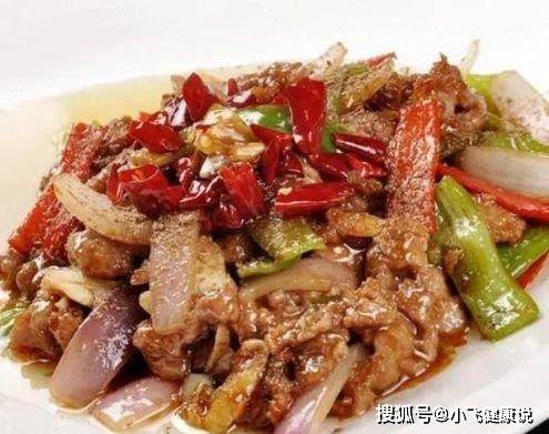 3、熱鍋冷油,放洋蔥、青椒、紅椒煸炒片刻,放牛肉片炒熟;