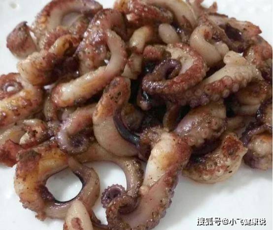 2.鍋內燒熱油,直接將章魚倒入鍋中,反復翻炒,縮小後用鍋鏟不斷壓干章魚身上水分,章魚邊會出現黃色的焦化物質,翻面,繼續按壓,注意不要焦了。待章魚水收了差不多了,就可以撒一點點現磨的黑胡椒出鍋啦!