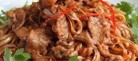 3、鍋里放菜油燒熱,先下京蔥段煸香,待加入寬面炒至干香時,加入羊裡脊片、紅椒絲、自磨孜然粉、辣椒粉和胡椒粉,炒勻裝盤後,撒上香菜段即成。