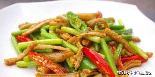 3.鍋中倒入食用用燒至5成熱的時候,把姜和大蒜放進去爆香,倒入壓好的肚絲翻炒,大火翻炒片刻,放入青辣椒紅辣椒同炒。