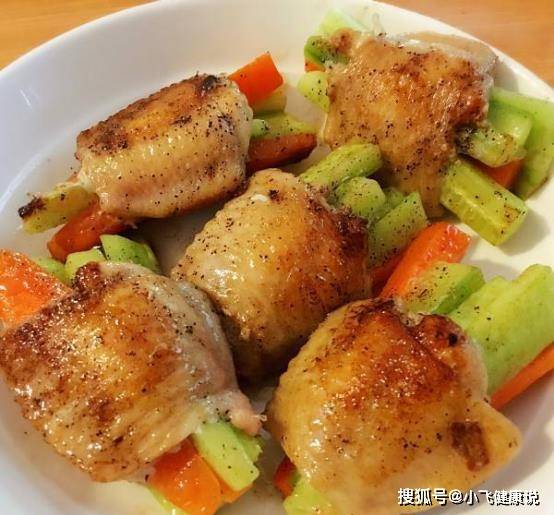 4.將胡蘿卜、蟹味菇、火腿腸塞入醃制好的去骨翅中內。