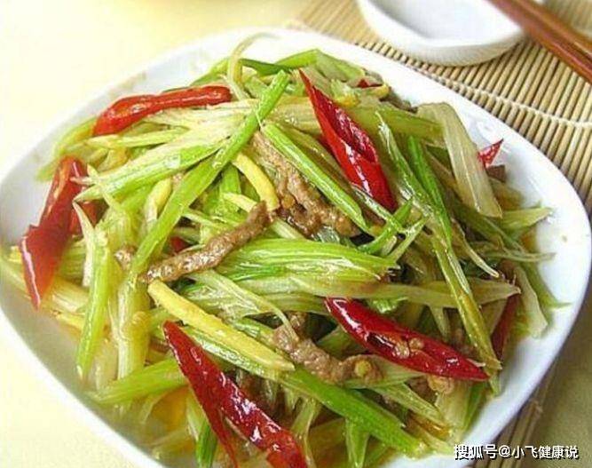 食材:芹菜絲,牛肉絲,泡椒絲,姜絲。