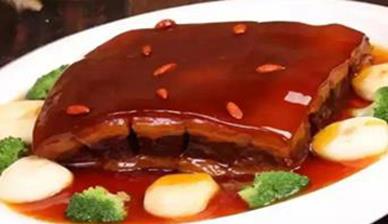 1、精膘五花肉(肥瘦肉為1∶1,軟糯和勁道的口感對比鮮明)6斤,放置在熱鍋壁上炙烤去除表皮的毛,清洗干淨後放入冰箱凍7-8小時。取出放至稍微融化後改刀成3厘米見方的塊,放入加有蔥、姜的沸水中焯5分鍾至豬皮表面成熟,撈出控干。