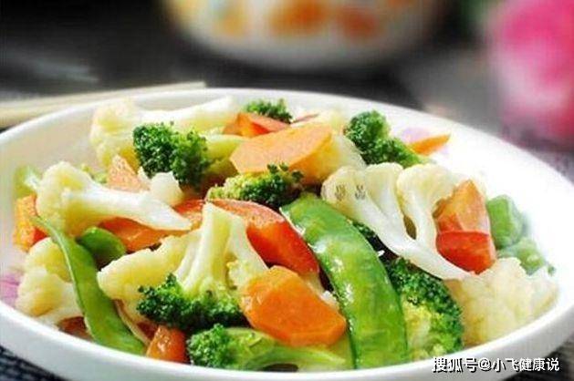 食材:西蘭花、菜花、胡蘿卜、彩椒、荷蘭豆、蒜片、白砂糖、水澱粉、鹽、油。