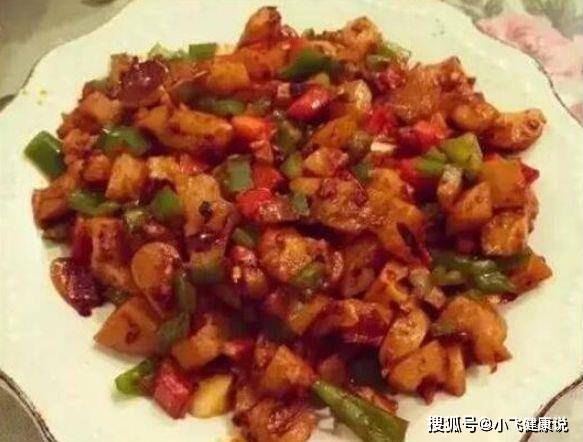 2、油熱下干辣椒 ,姜蒜 ,花椒,蔥頭,中火炒出香味,把雞塊放下去爆炒,後放土豆,加水慢煮。