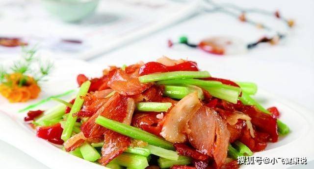 1.香芹去根,摘下葉子更存;胡蘿卜切細條,和芹菜一般粗細;臘肉切片;蒜切片.