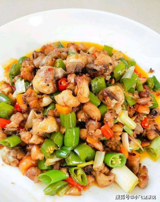 5.尖椒的辣味炒出來後倒入炸好的雞肉了,加鹽,炒到尖椒變色就可以了