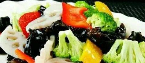 1. 把蓮藕刨去皮,均勻切成薄片。青紅椒和西藍花分別切成小塊備用。