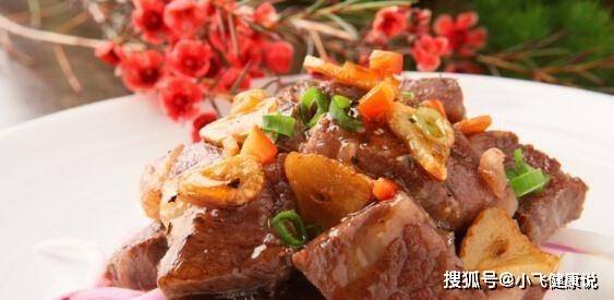 1、將雪花牛肉切成四方形粒。