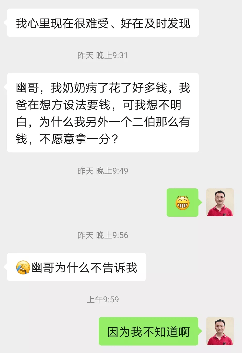 但有些問題,就沒必要問了,星球我沒回答你還追到微信,比如下面這位女孩,各種想法你難受或者訴苦,也就算了。現在你奶奶生病住院,但你的某個二伯不願意出錢,他為什麼不願意出錢?